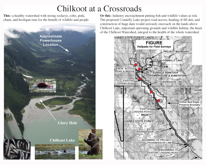 Issues/Threats to the Chilkoot Watershed:The most serious threat to the future sustainability of a healthy Chilkoot Watershed is a proposed hydro-power project, known as the Connelly Lake Project, that would involve constructing a dam at the outlet to Connelly Lake in the upper watershed. Roads and power lines would have to be installed up the left side of Chilkoot Lake and through the sensitive wetland salmon spawning habitat areas above Chilkoot Lake in an area that was set aside as part of the Chilkat Bald Eagle Preserve (diagonally crosshatched area on the map) because of its importance as salmon habitat. The project is proposed to produce 12 megawatts of power.